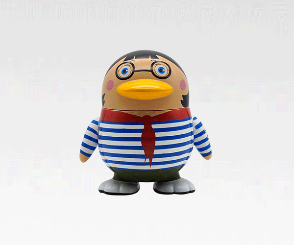 學生鴨戴著鮮紅的紅領巾,穿著藍白相間的衣服外形。一副靦腆呆萌的表情體現出生動學生氣息。